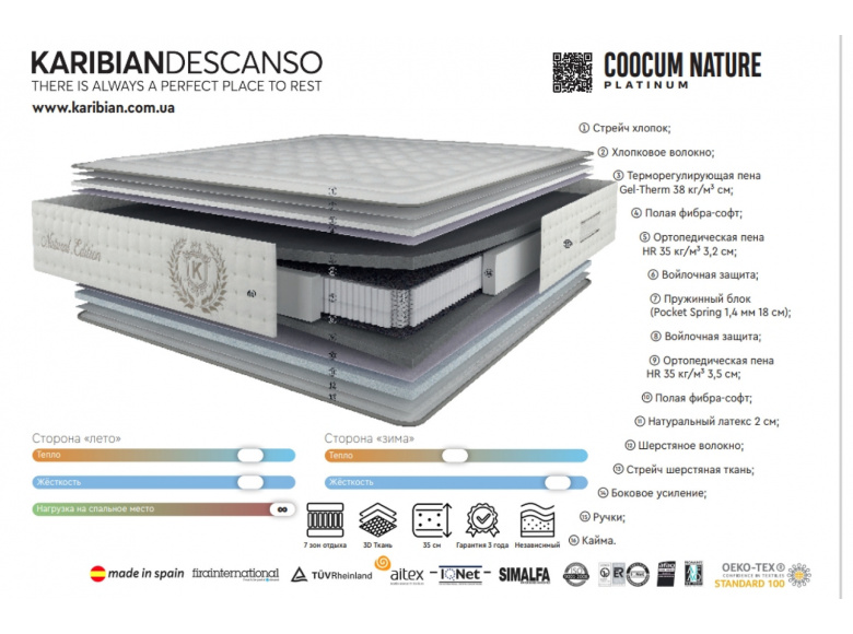 В основе матраса комбинация сверхпрочной испанской HR - пены и немецкого независимого пружинного блока Multi Pocket Spring позволяют выдерживать максимальную нагрузку. По всему периметру изделия надежные боковые усиления. Верхний слой Gel Therm и Visco Therm способствуют температурному балансу и кровотоку, снимают обратное давление на мышцы. Изысканный чехол из шерсти альпаки отлично испаряет влагу и не впитывает неприятные запахи.