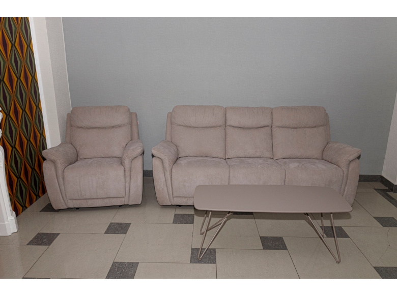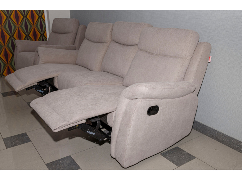 Комплект мягкой мебели Санта-Фе от бренда BOAS - это блестящее решение для вашего интерьера. Комплект включает трехместный диван и два кресла. И диван и кресла оснащены механическими реклайнерами. Это наделяет комплект эргономичностью и комфортабельностью. Благодаря реклайнерам Вы можете принять удобное положение, положив руки на широкие мягкие подлокотники, а ноги - на выдвижную подставку.  Высококачественный наполнитель (пенополиуретан) делает мебель особенно мягкой.