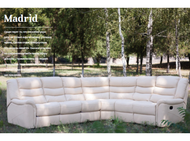 Угловой диван МАДРИД от бренда BOAS прекрасное решение для создания комфортной зоны отдыха. Механизм раскладки является гостевым вариантом и не предназначен для ежедневного использования. Каркас изготовлен из массива эвкалипта, а боковые и мелкие элементы из высококачественной фанеры. Механический реклайнер - подножка для ног, обеспечивает дополнительный комфорт и удобное расположение на диване. Обивка дивана (передняя тактильная часть) – натуральная кожа. Задняя, нижняя и боковые части - эластичная, прочная экокожа.