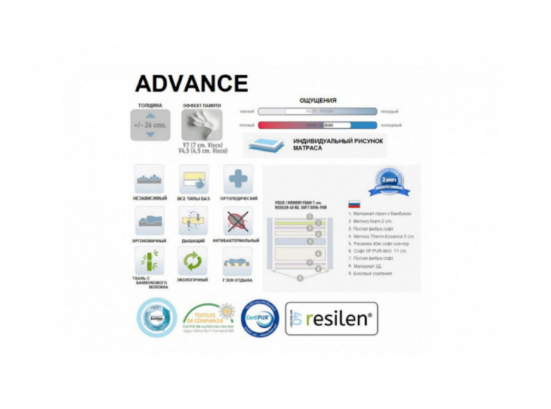 Основа матраса - высококачественный HR - пенополиуретан с боковыми усилениями позволяет изделию быть максимально прочным и устойчивым к износу. Высокий слой пены с эффектом памяти придает мягкости, оказывает наименьшее давление на подкожные сосуды и нервные окончания, способствует лучшему кровотоку. Чехол из волокон бамбука с антисептическими свойствами прекрасно абсорбирует влагу.