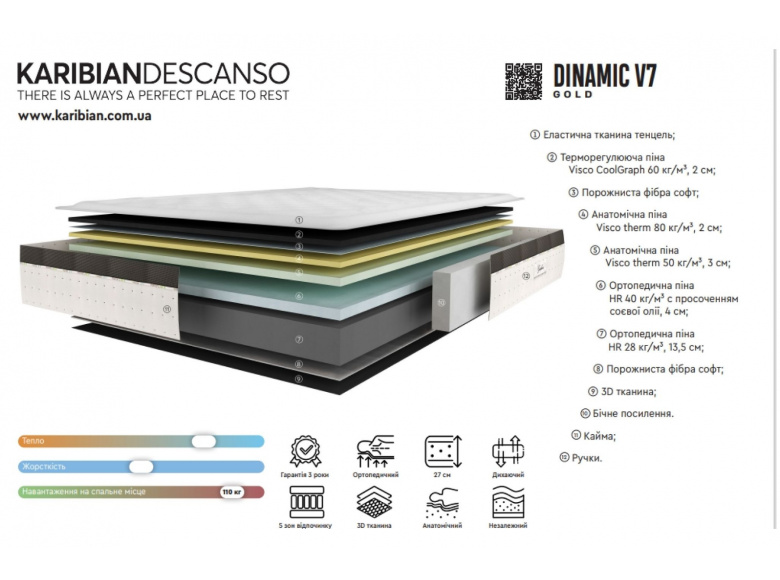 Основные характеристики чехла из Tencel: регулирование температуры тела, поглощение влаги, естественный барьер для размножения бактерий, пылевых клещей и грибков. Матрас с отличной ортопедической поддержкой благодаря высокотехнологичному HR - пенополиуретану и боковым усилениям. Анатомическая пена Visco Therm снижает обратное давление, и способствует циркуляции крови.
