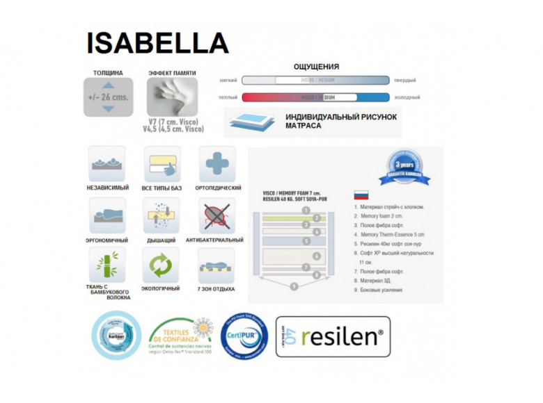 Мягкий матрац с отличной ортопедической поддержкой благодаря высокотехнологичному HR - пенополиуретану и боковым усилениям. Анатомическая пена Visco Therm снижает обратное давление и способствует циркуляции крови. Чехол из бамбукового волокна - эластичный, антибактериальный. Борт матраса прошит прочной тканью, меньше подвержен загрязнению и затиранию.
